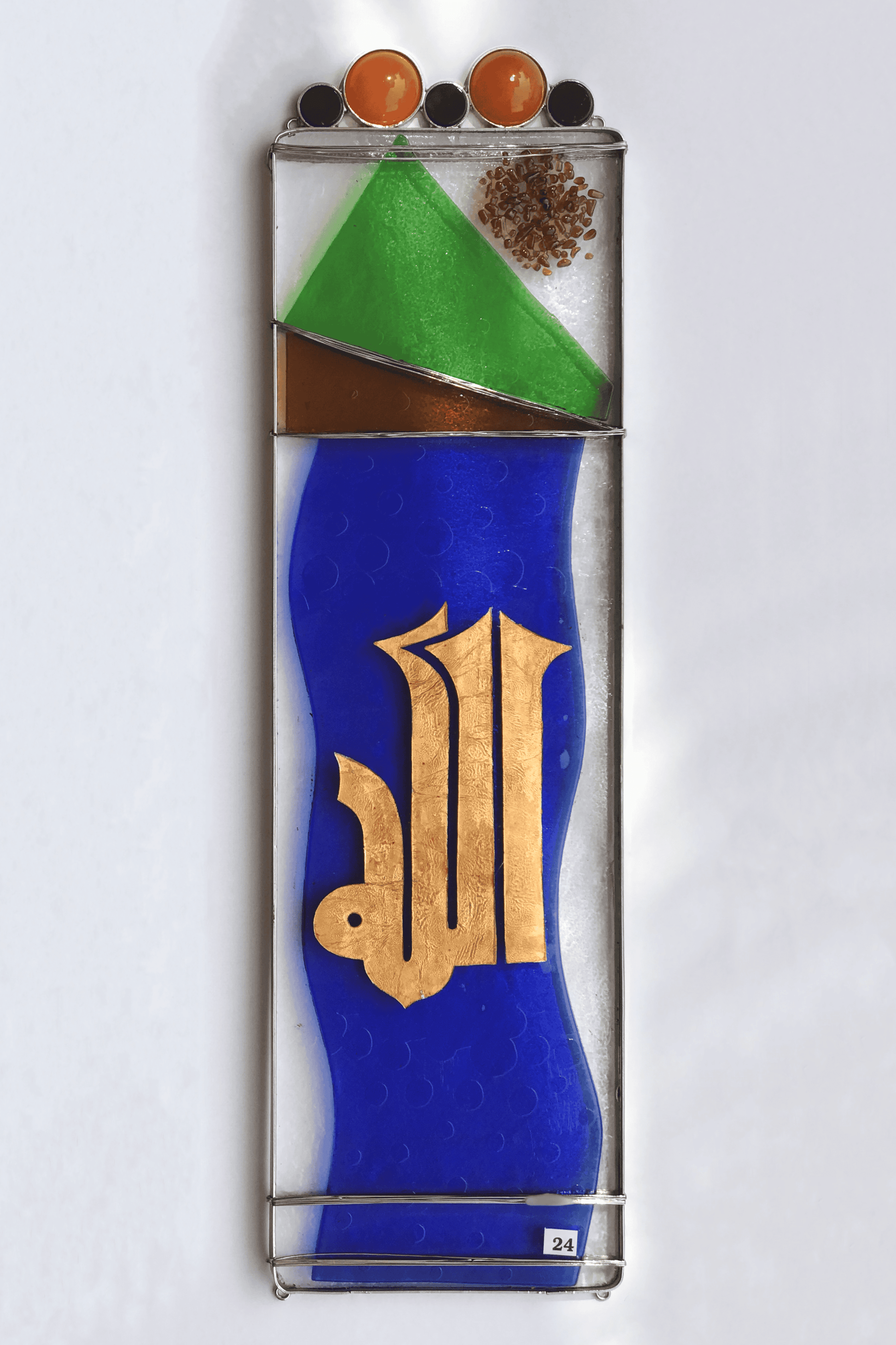 ALLAH- (Wall Hanging), Calligraphy by Shakil Ismail, Metal and Glass Casting with Semi Precious Stones, 6 x 22 inches