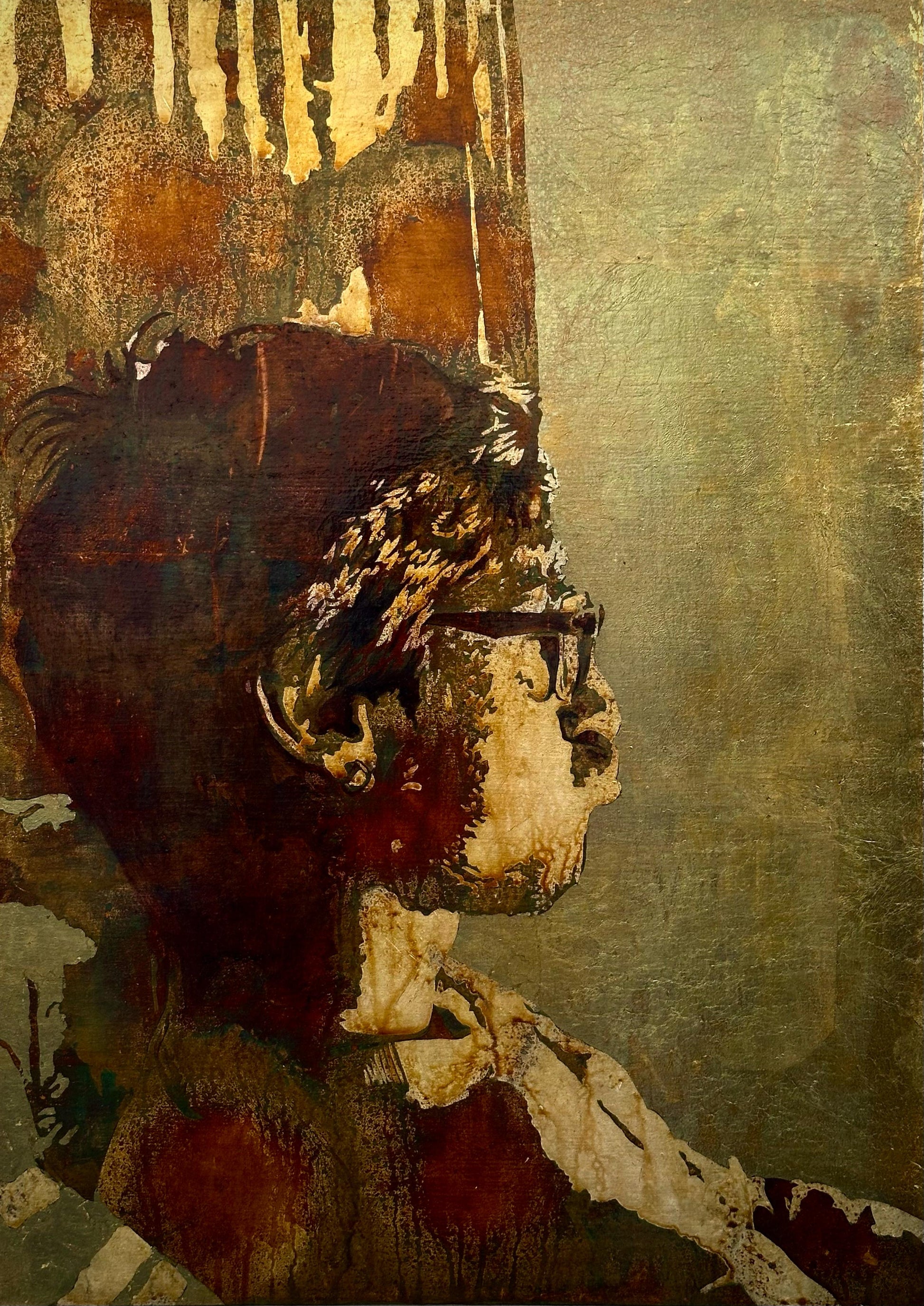 Back to the Broadcast, Portrait Painting by Swarim Abid, Oxidized Silver leaf on Canvas, 19.5 x 27.5 inches