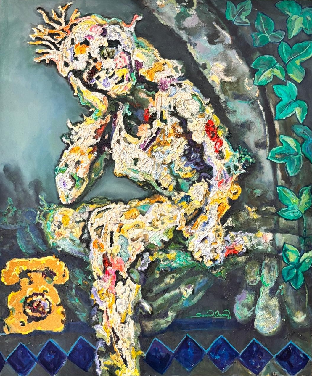 "Talk to me", Figurative Painting by Samra Cheema, Oil & Gold Leaf on Canvas, 30 × 35.8 inches