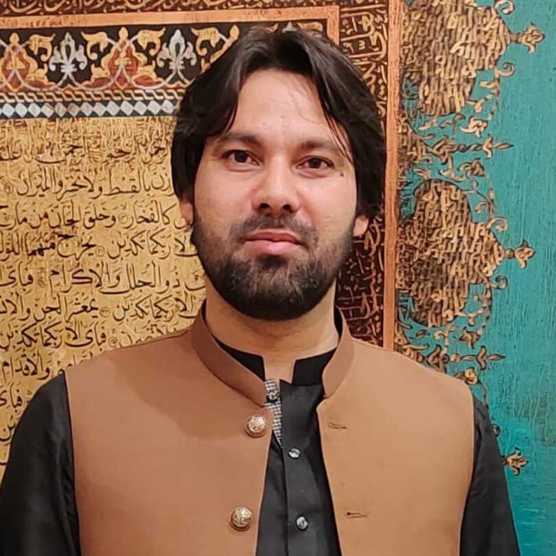 Syed Rizwan is a Pakistani calligraphy artist from Faisalabad, born in 1991. Trained under Sir Ejaz Yousafi, he specializes in Islamic calligraphy, blending traditional scripts with Moroccan and Italian ornamentation. His works, featuring Quranic verses, have been exhibited across Pakistan, including a solo show titled "Al Mustaqeem" in 2022.