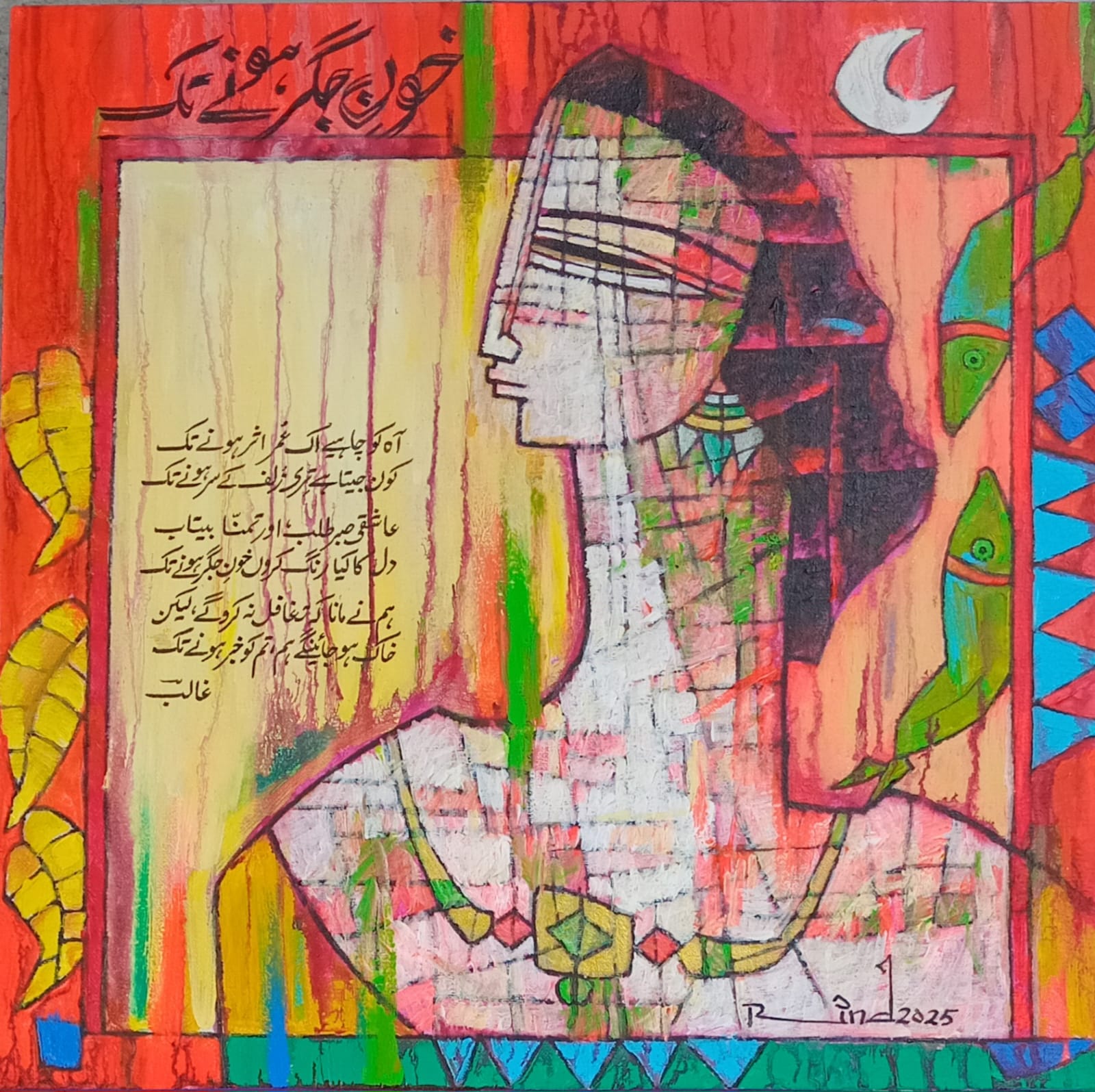 A.S. Rind, born in 1960 in Rahim Yar Khan, is a Pakistani artist renowned for his vibrant figurative paintings that blend traditional motifs with contemporary themes. A graduate of the Central Institute of Arts and Crafts, Karachi, he has held numerous exhibitions both nationally and internationally. His work often features stylized female forms, rich colors, and poetic inscriptions, reflecting the cultural heritage of regions like Rajasthan.