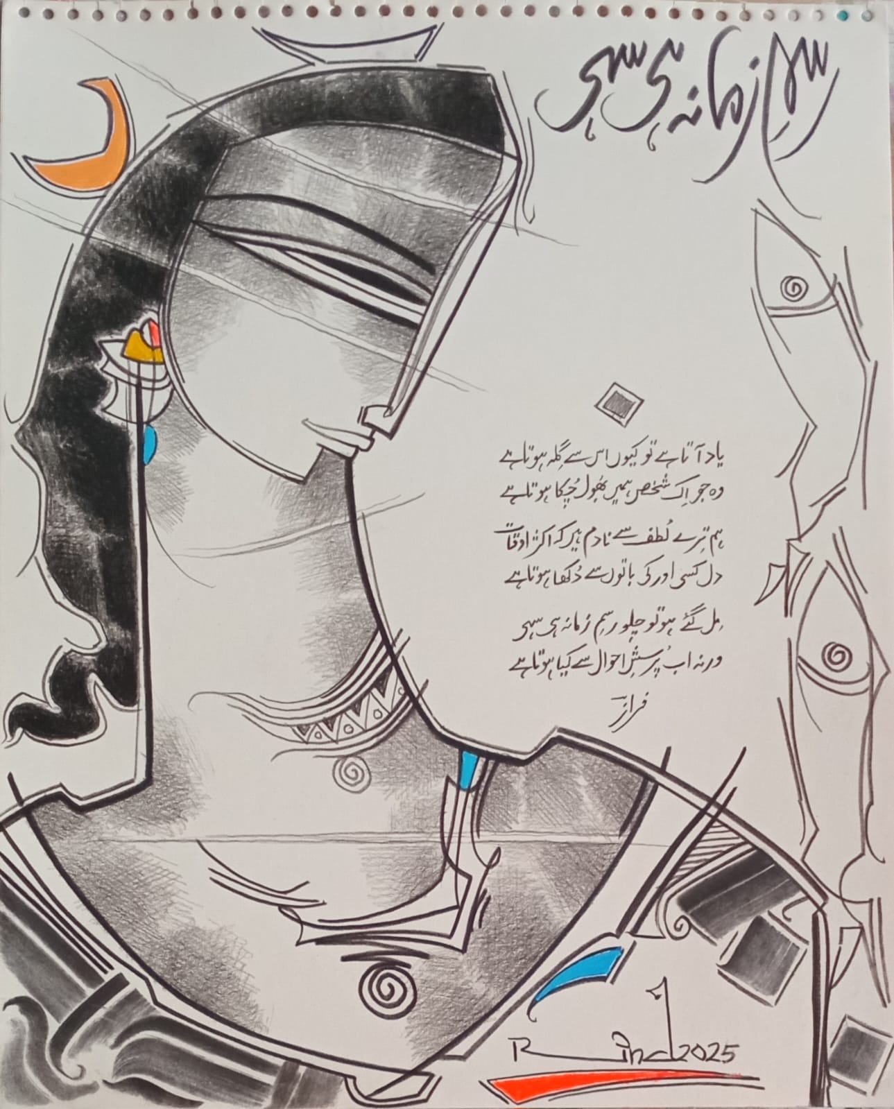 A.S. Rind, born in 1960 in Rahim Yar Khan, is a Pakistani artist renowned for his vibrant figurative paintings that blend traditional motifs with contemporary themes. A graduate of the Central Institute of Arts and Crafts, Karachi, he has held numerous exhibitions both nationally and internationally. His work often features stylized female forms, rich colors, and poetic inscriptions, reflecting the cultural heritage of regions like Rajasthan.