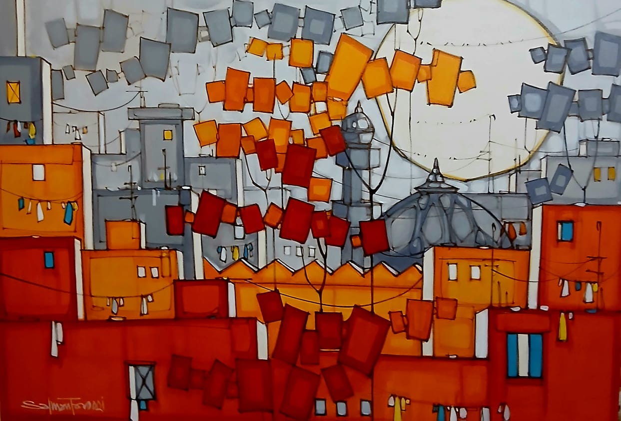 Salman Farooqi, a Karachi-born artist and Karachi School of Art graduate, is acclaimed for his vibrant, cubist-inspired cityscapes. Mentored by Eqbal Mehdi and Sam Abbas, his stylized acrylic paintings capture Karachi’s essence through geometric forms and bold colours. Farooqi’s work has been exhibited locally and internationally, earning recognition for its energy, optimism, and visual appeal.